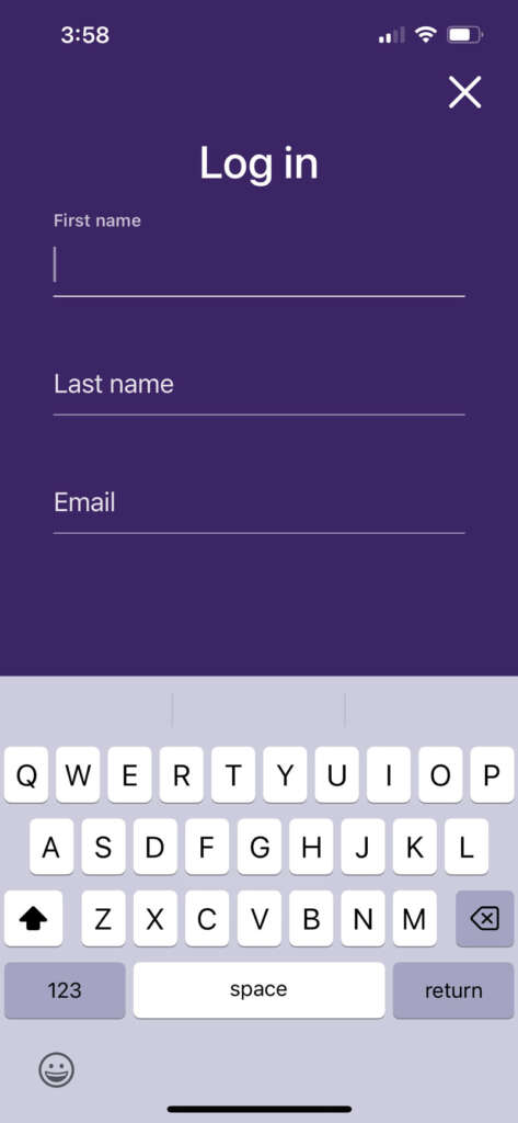 - Log in to the app by entering the exact First name, Last name and email address you used during your registration. This information can be found in the “Welcome to the 2024 AME Meetings App” email you received.
